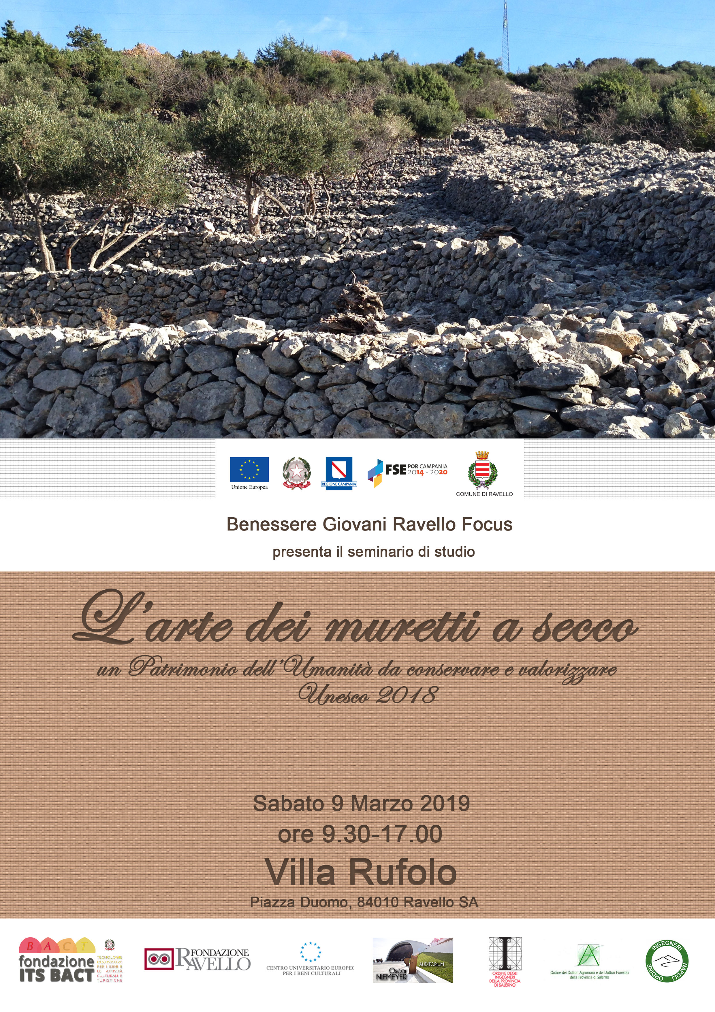 RAVELLO – Nel quadro dell’iniziativa “Benessere Giovani – Ravello Focus” verrà organizzato, nella giornata di Sabato 9 Marzo 2019 alle ore 9.30 presso Villa Rufolo (Ravello – SALERNO), il seminario di studio “L’Arte dei muretti a secco: un Patrimonio dell’Umanità da conservare e valorizzare – UNESCO 2018”.