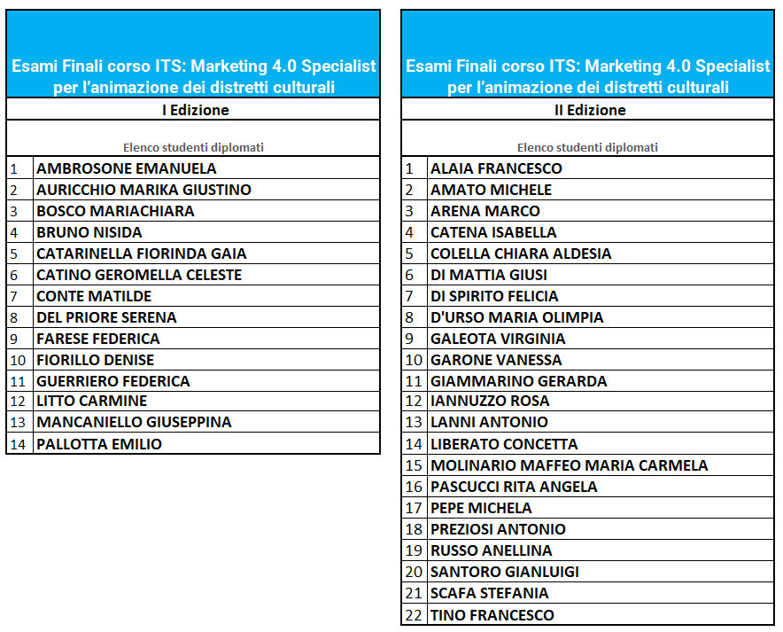 Gli esami, iniziati il 18 Luglio 2023 con la Prova Scritta e con la Prova Teorico-Pratica nella giornata del 19 Luglio, sono proseguiti oggi, 20 Luglio, con la sessione della Prova Orale, sempre ad Avellino presso la sede dell'Ex Carcere Borbonico. Si comunica che tutti coloro che hanno sostenuto gli esami del primo appello hanno superato le tre prove, pertanto conseguono il titolo ITS. Si pubblica l'elenco dei nuovi diplomati.